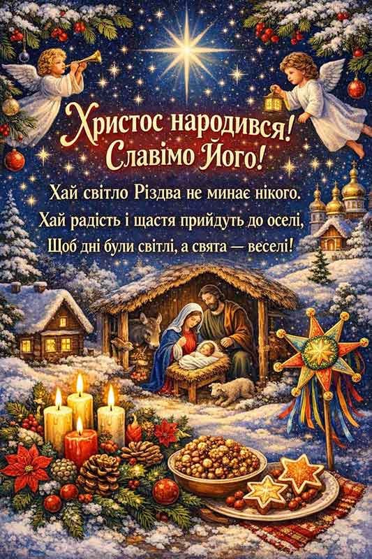 Зі світлим Різдвом вітаємо!Від краю до краю бажаємо:Здоров’я і мирного неба.Нехай справи вдаються, як треба.І світлою буде дорога.Нехай закінчиться тривога.На серці хай радісно буде.Хай Мир і добро будуть всюди!